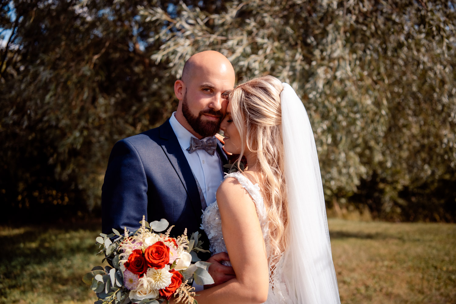 Das Brautpaar hatte sich gemeinsam mit mir dafür entschieden, das Fotoshooting für die Brautpaarportraits in zwei Teile aufzuteilen. Die ersten Fotos entstanden so bei strahlendem Sonnenschein direkt nach der freien Trauung am Gut Thurnsberg. Und für den zweiten Teil hatten wir uns den Sonnenuntergang ausgesucht – meine Lieblingszeit für Fotos. Je nach Jahreszeit haben wir dann zwar nicht ganz so viel Zeit – denn wenn die Sonne weg ist, dann ist sie weg – aber dafür ist das Licht in der Abendsonne so unvergleichlich, dass ich jedem Paar empfehle, zumindest einige wenige Bilder, wenn nicht sogar das gesamte Shooting mit mir in diese besondere Lichtstimmung zu legen.